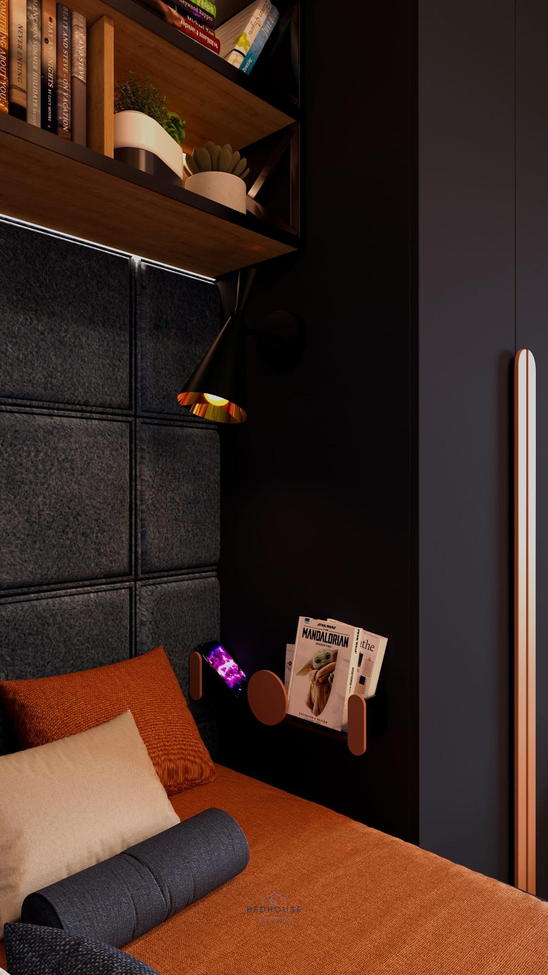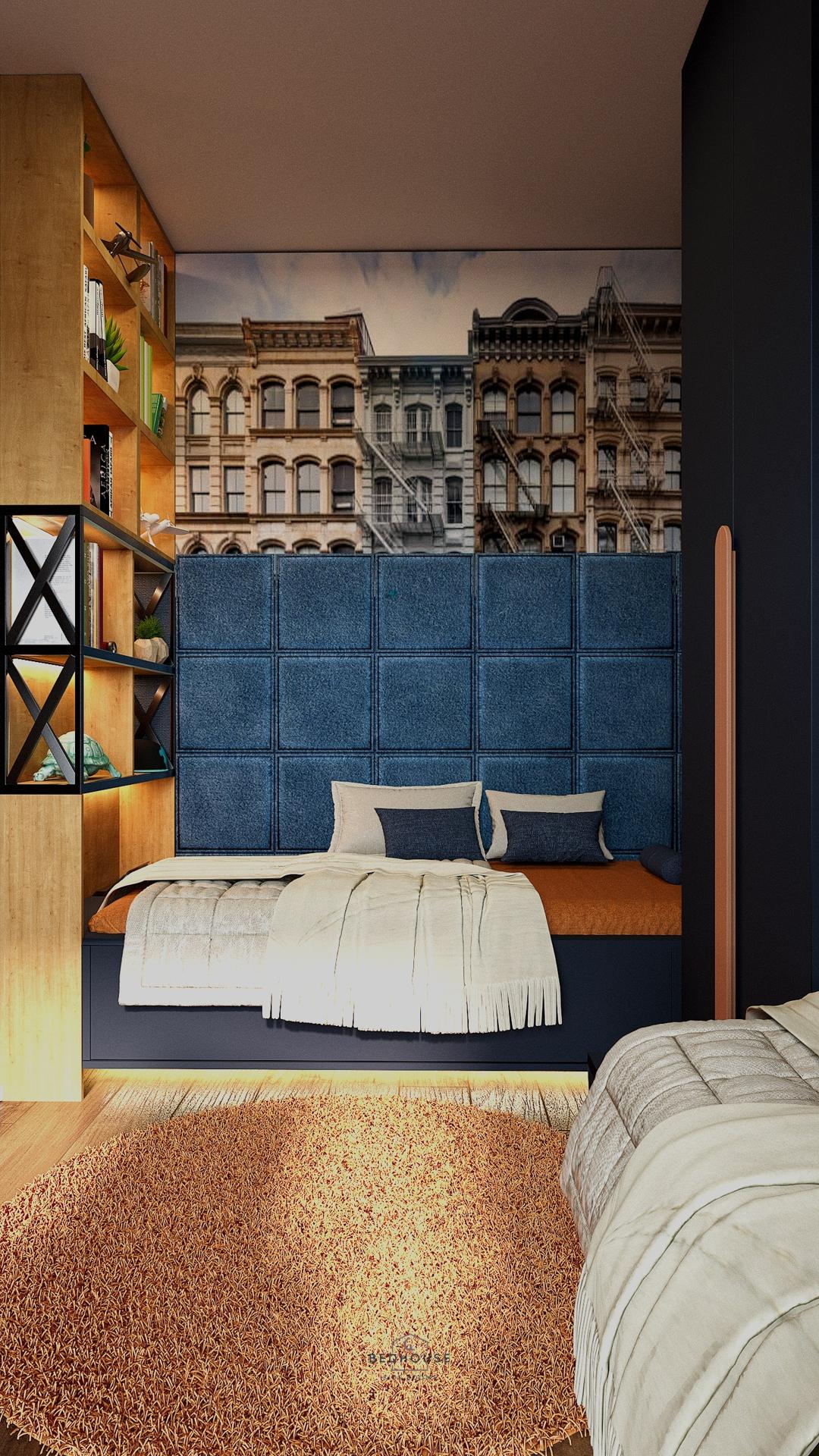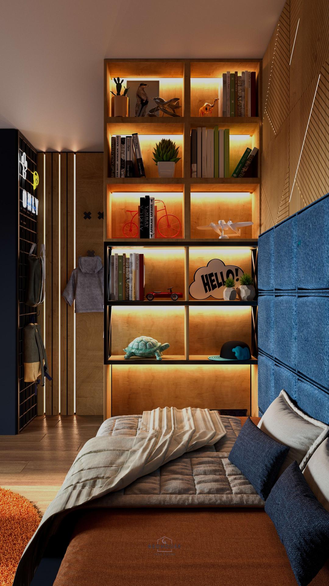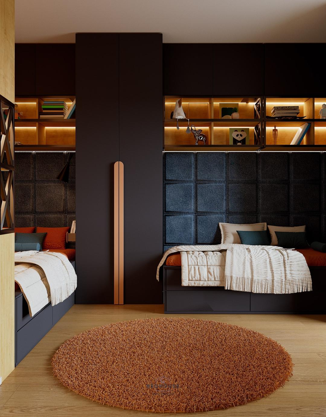 Дизайн дитячої кімнати для двох хлопчиків виконаний у глибоких темно-синіх відтінках, що створюють стильний та водночас затишний простір. Велика кількість продуманої підсвітки додає інтер’єру сучасності, наповнює кімнату атмосферою комфорту та робить її функціональною у будь-який час доби.