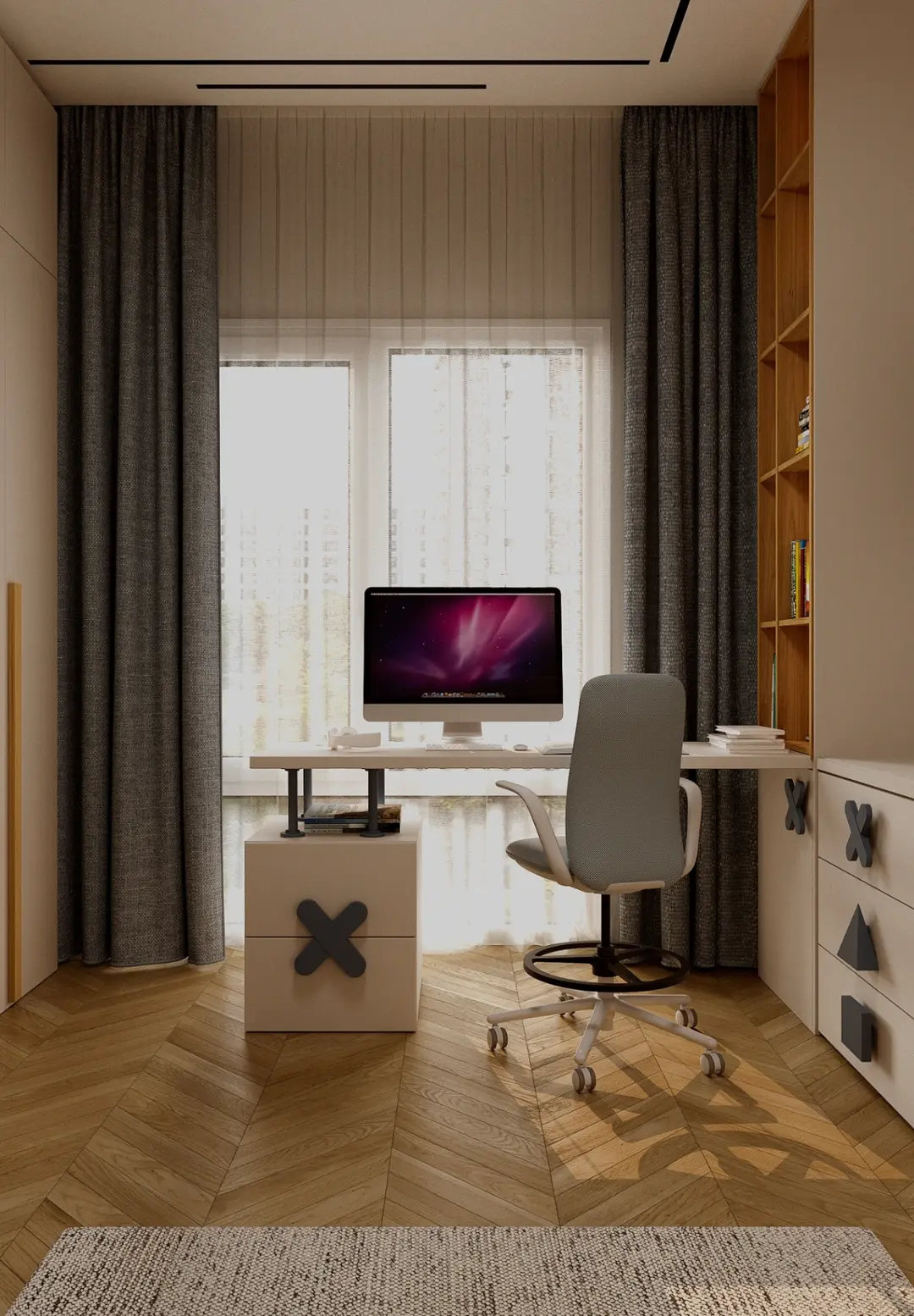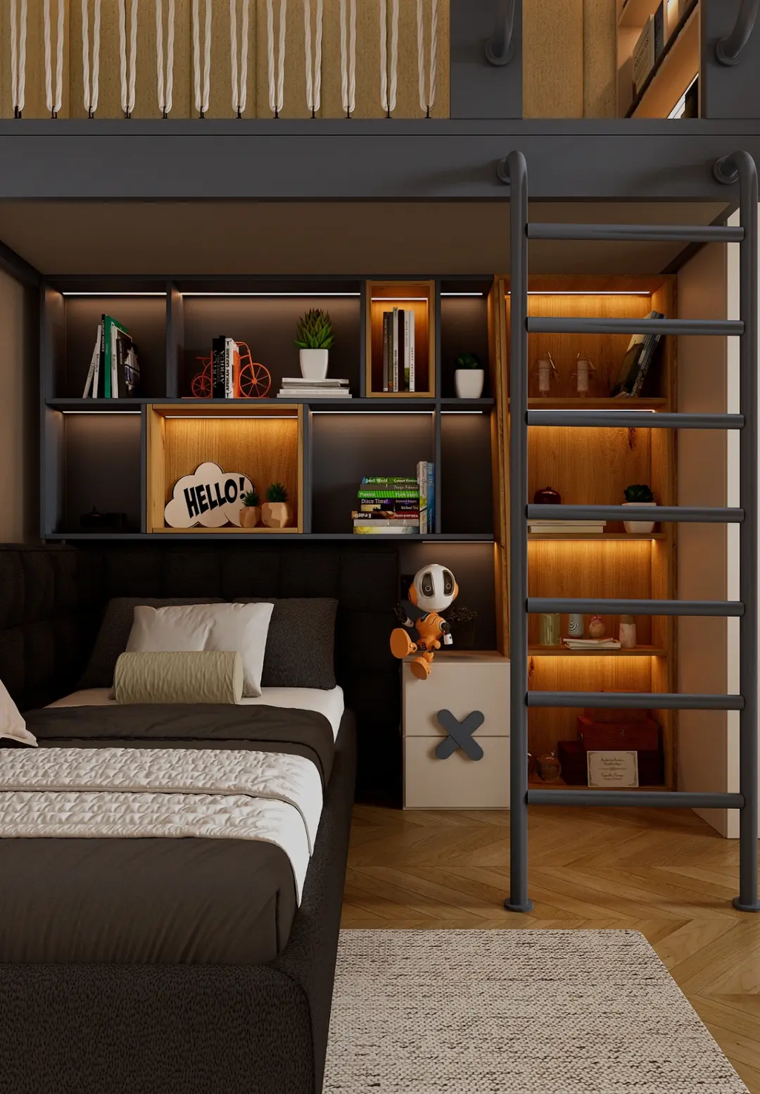 У просторі гармонійно об’єднані зона відпочинку, навчання та зберігання. Ліжко з м’яким узголів’ям і продуманим стелажем створює затишне місце для сну й релаксу.