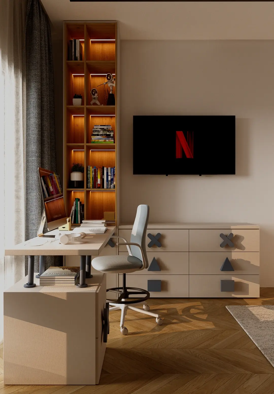 Робоче місце біля вікна має ергономічний стіл, зручне крісло та високий стелаж із підсвіткою — усе для натхнення та зосередженої роботи.