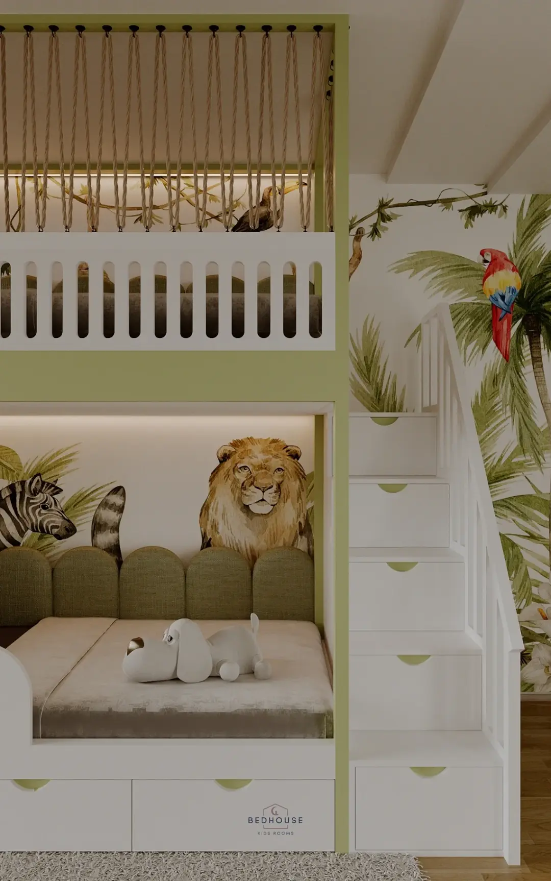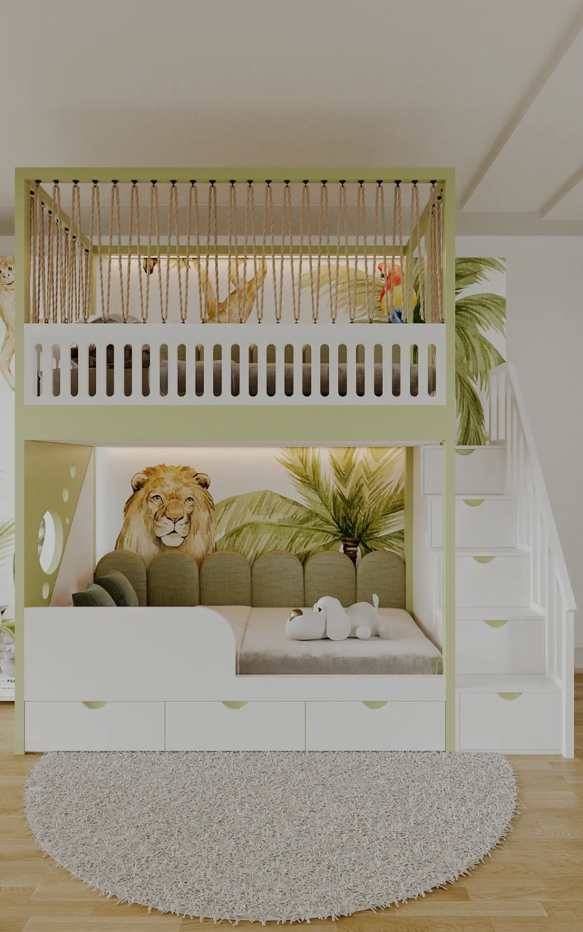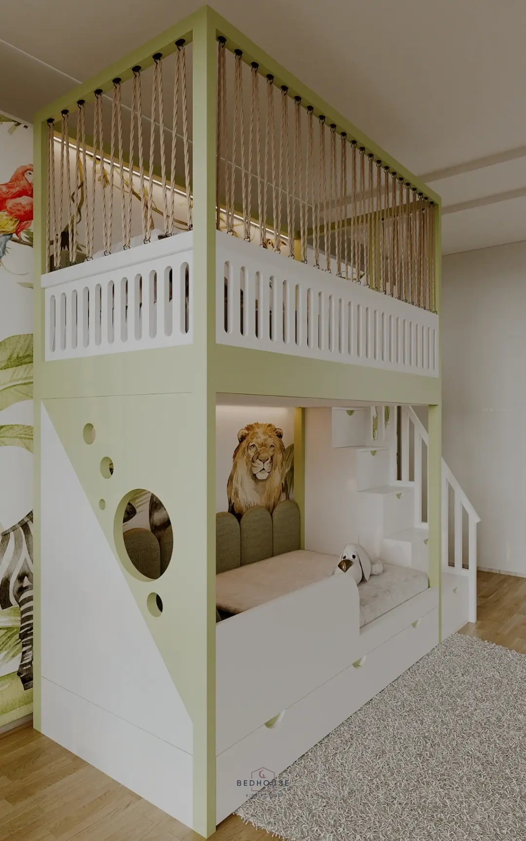 Обидва поверхи обладнані м’якими панелями та підсвіткою, що створює затишну атмосферу та додає комфорту у вечірній час. На першому поверсі розміщено захисний бортик і декоративну панель з отворами, яка надає легкості дизайну, а на другому — фрезерований бортик із канатами, що додає інтер’єру виразності та оригінальності.