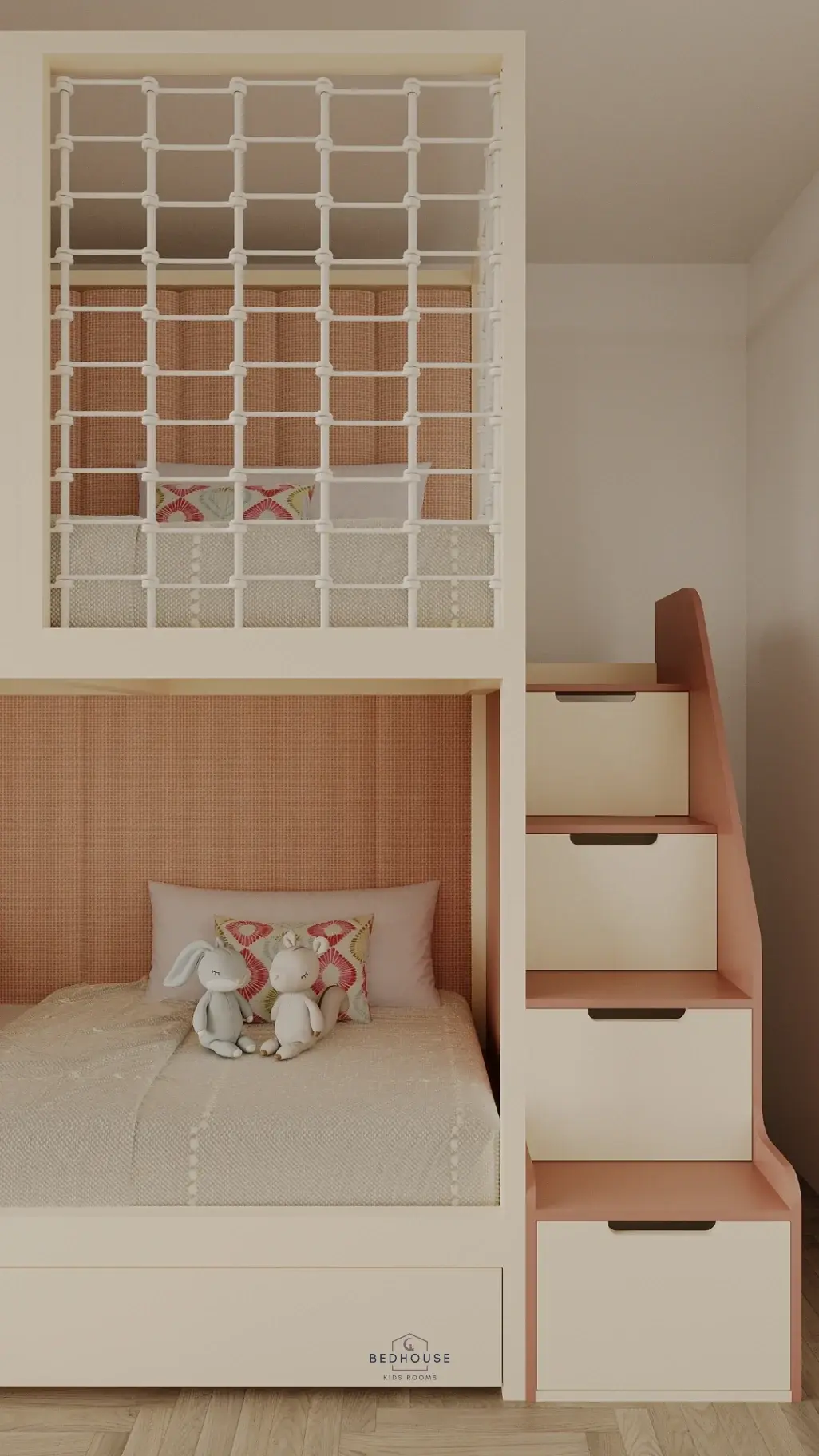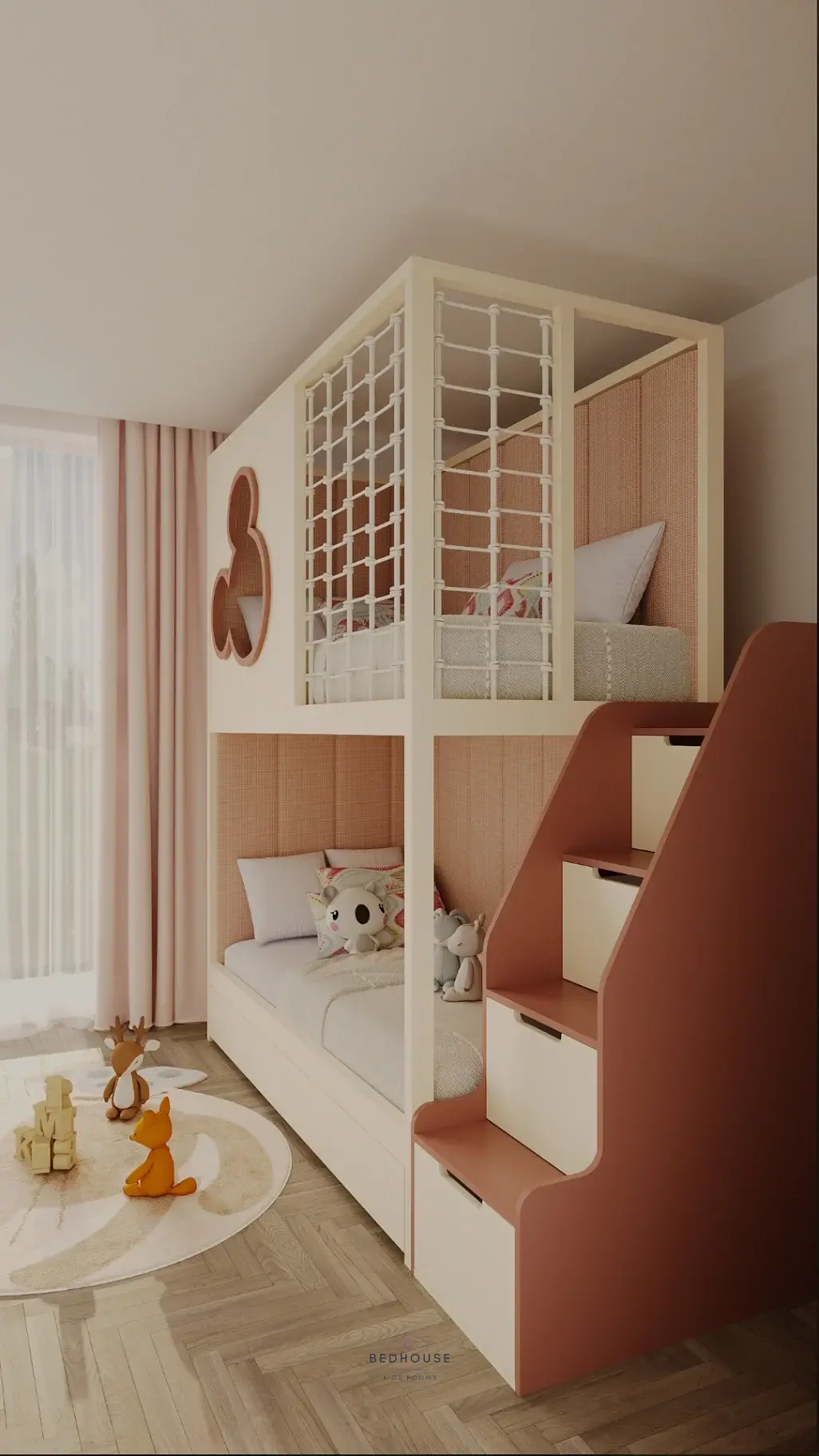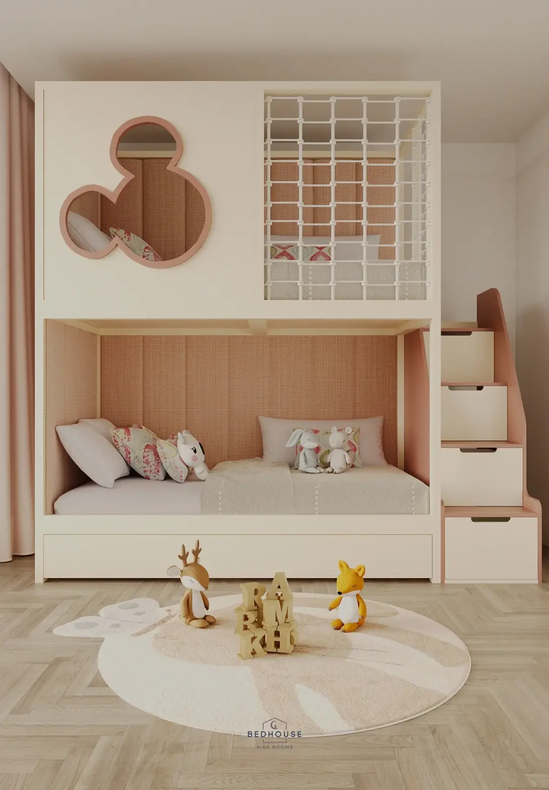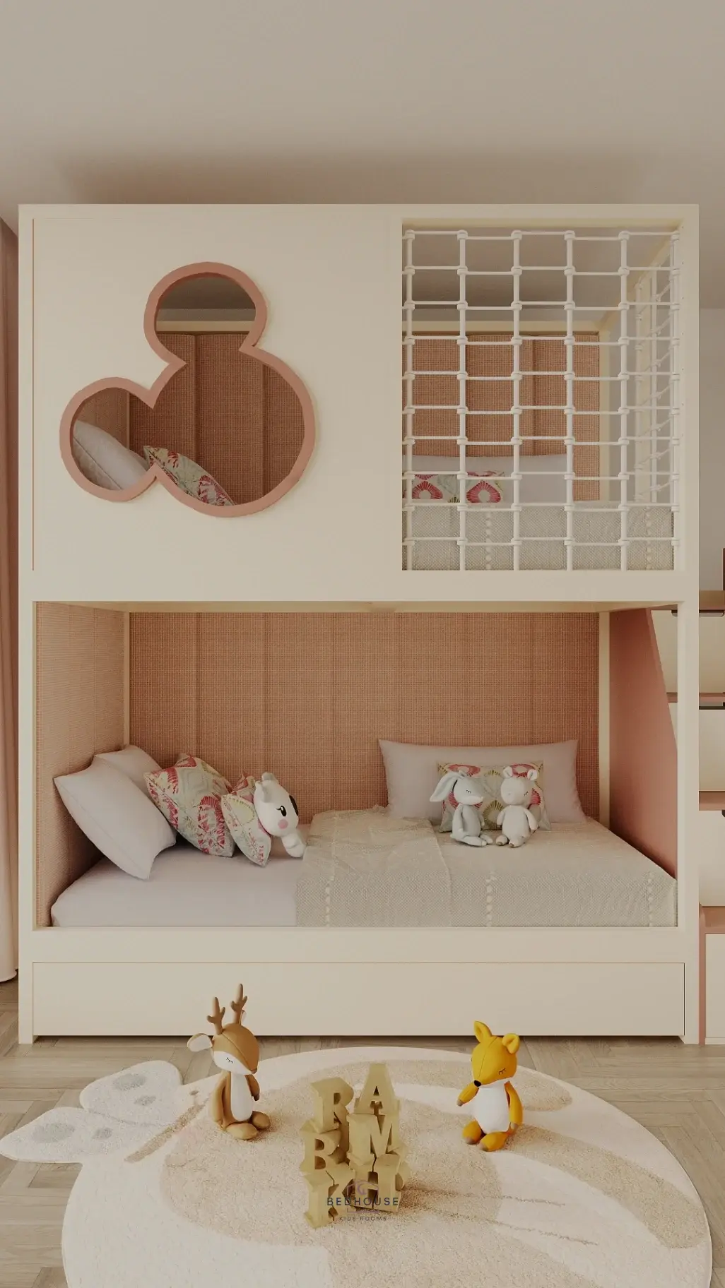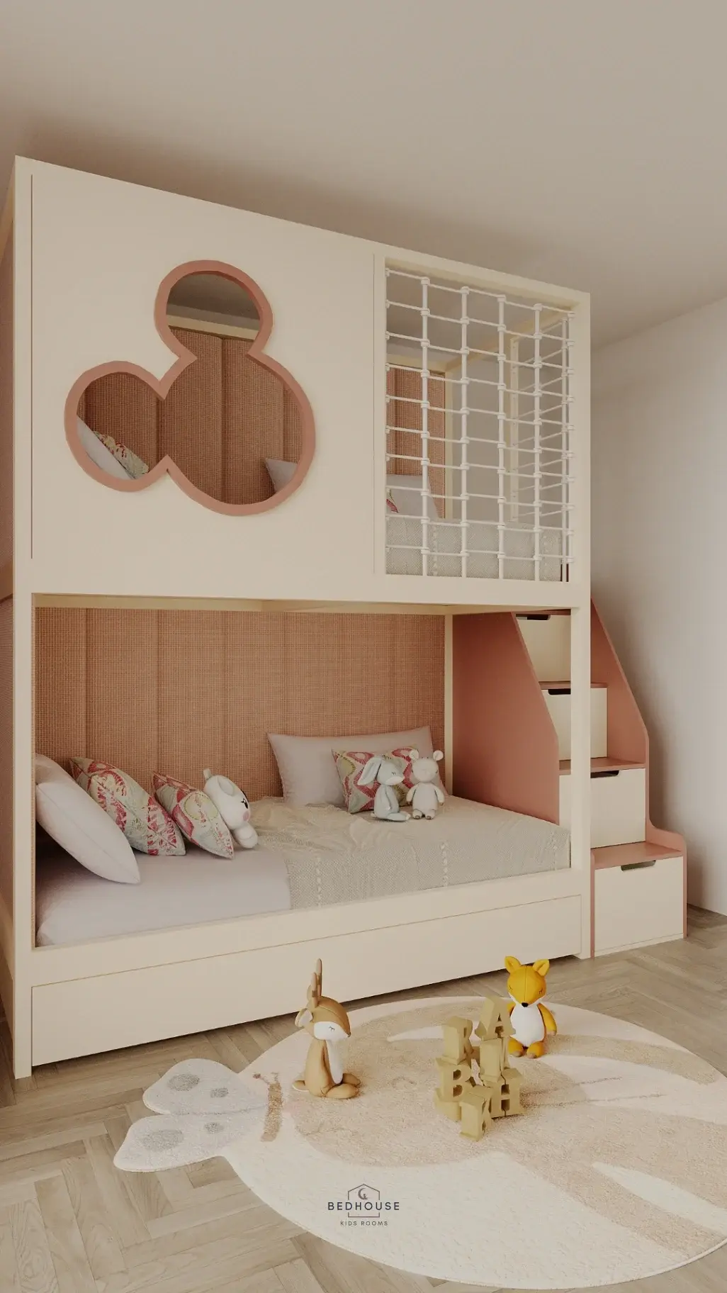 Ліжко «Мікі» поєднує в собі міцність і казковий дизайн. Каркас виготовлений з масиву ясена, що гарантує надійність і довговічність. М’які панелі на першому та другому поверхах створюють комфортне та затишне середовище для сну та відпочинку. Зручні сходи оснащені шухлядами для зберігання іграшок або речей. Лицьова панель прикрашена декоративною накладкою у вигляді Мікі — чарівний акцент для будь-якої дитячої кімнати.